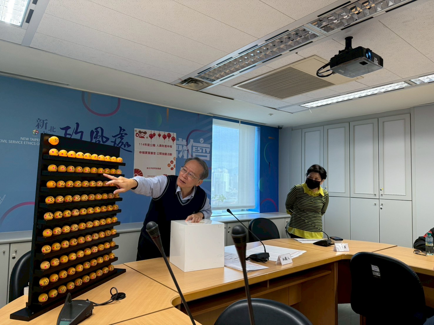 本次列入抽籤之申報人計有秘書長邱敬斌等101人,依10%比例抽出11人,與會人員共同檢視抽籤名冊、籤球及籤筒後,王副處長王文清依序公開抽出11名中籤名單,並從中抽出1名辦理前後年比對,過程公開透明。