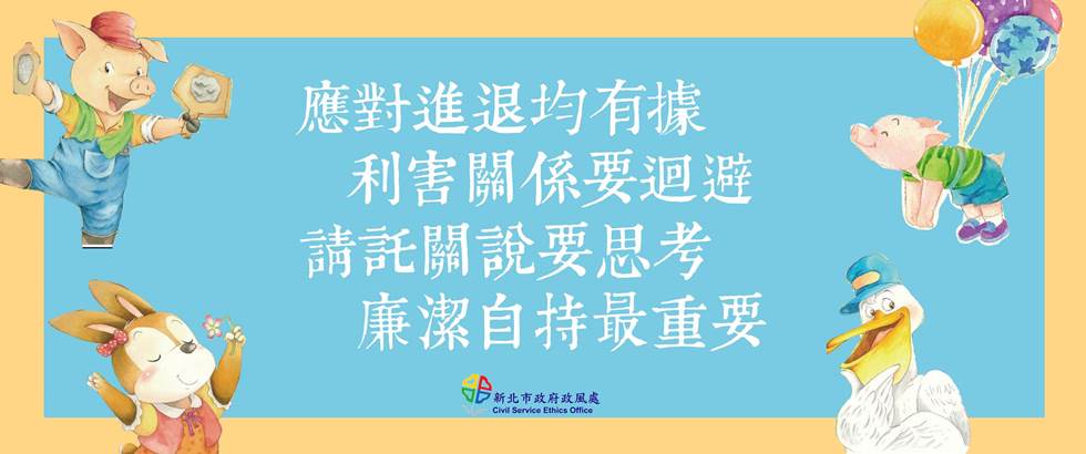 資料詳洽:政風處第二科股長 蔡睿璁 電話:本市境內 1999 或 (02)2960-3456 分機 7323 電子信箱:AJ4406@ntpc.gov.tw